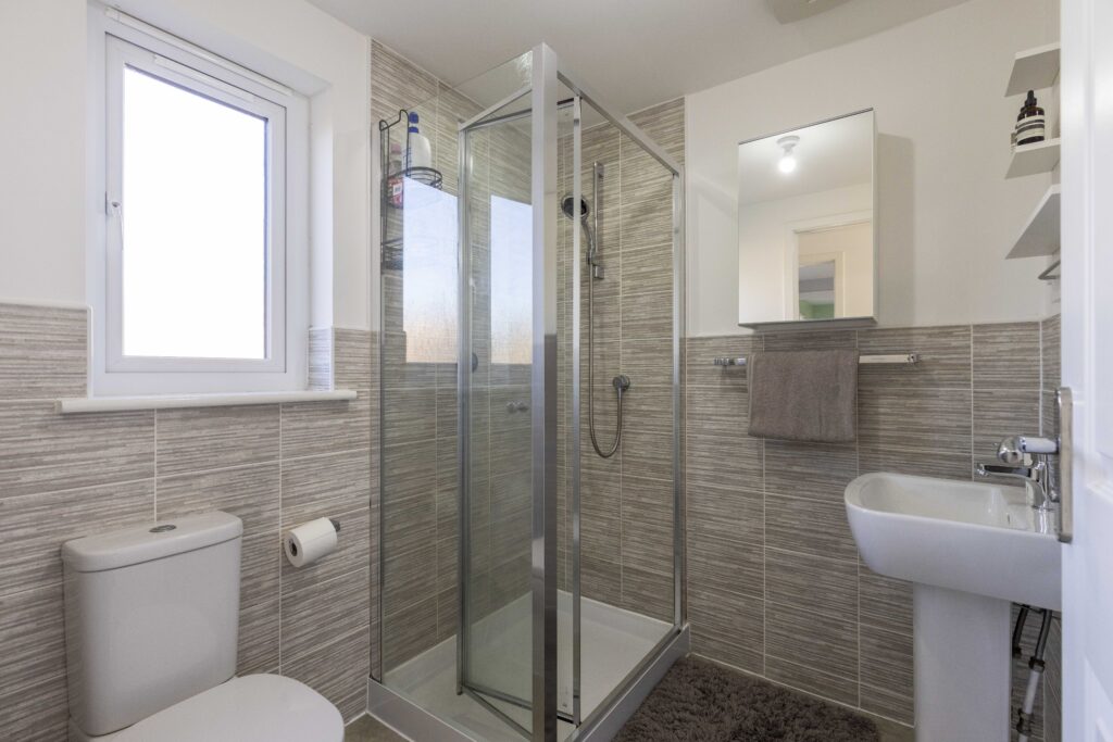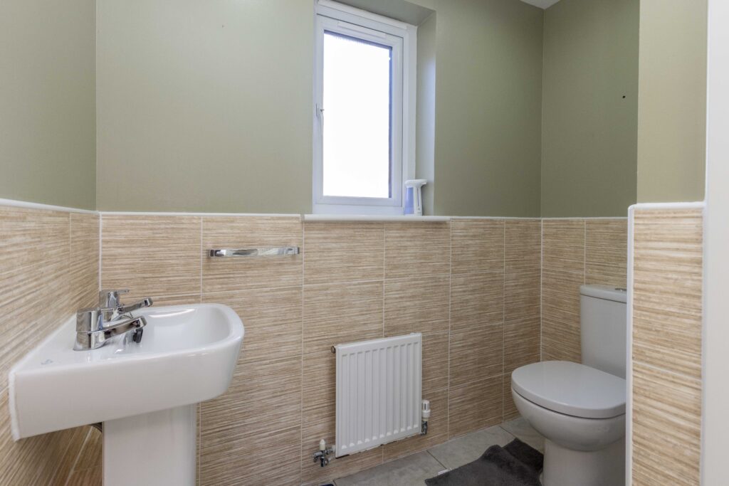 Na piętrze znajdują się trzy dobrze zaprojektowane sypialnie. Główna sypialnia posiada prywatną łazienkę z prysznicem, natomiast dla pozostałych domowników dostępna jest elegancka łazienka główna. Dodatkowym atutem jest toaleta na parterze oraz praktyczna przestrzeń na strychu.