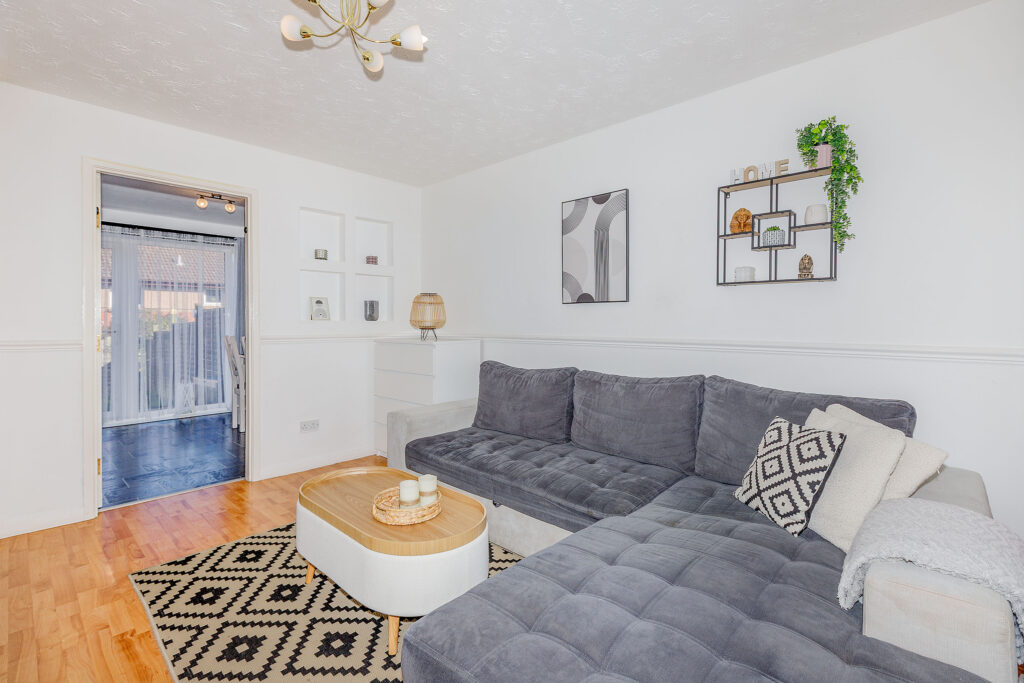 A bright, front-facing living room creates a warm and welcoming space, perfect for relaxing or spending time with family.