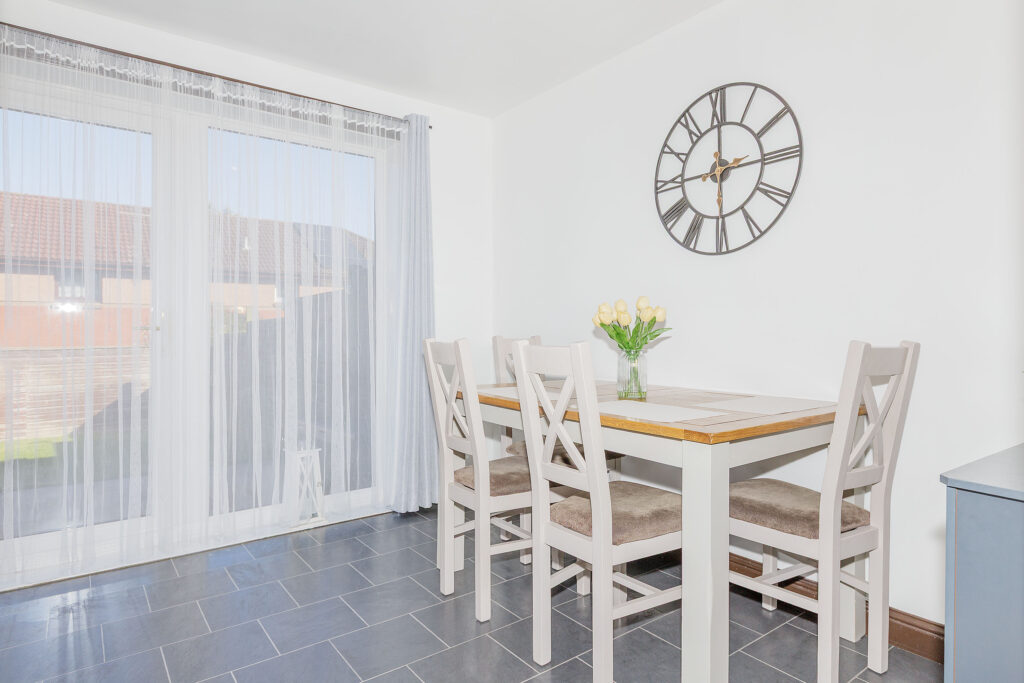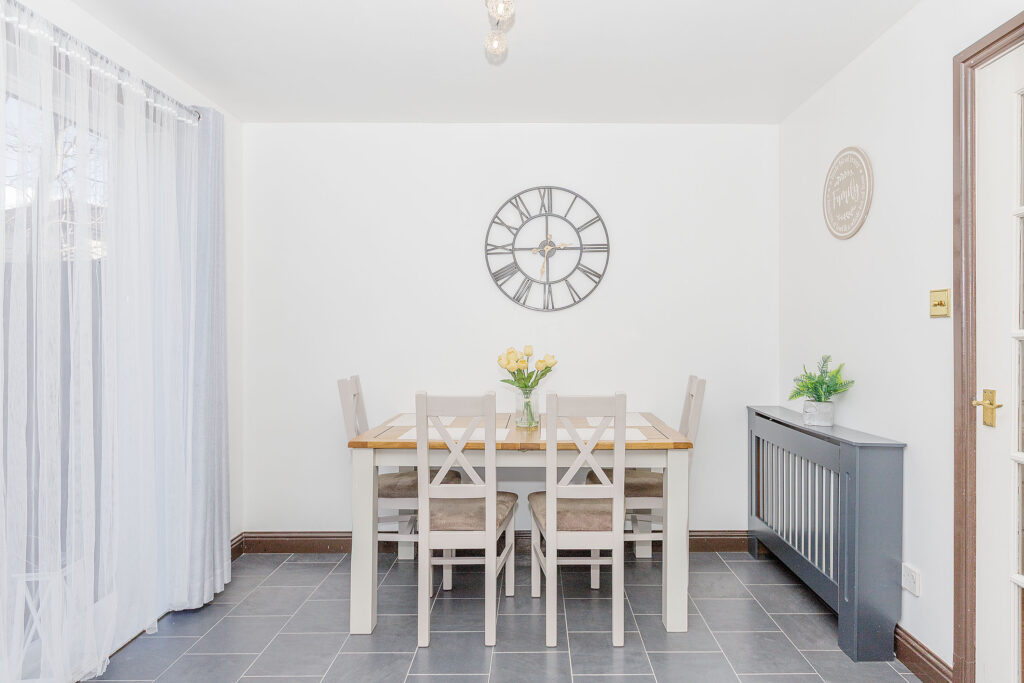 The generous dining area flows seamlessly into a modern, fully fitted kitchen complete with appliances, providing an excellent space for both everyday meals and entertaining guests.